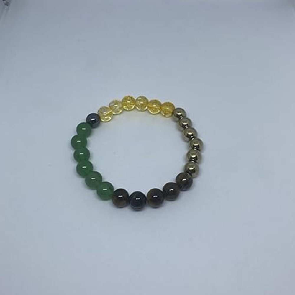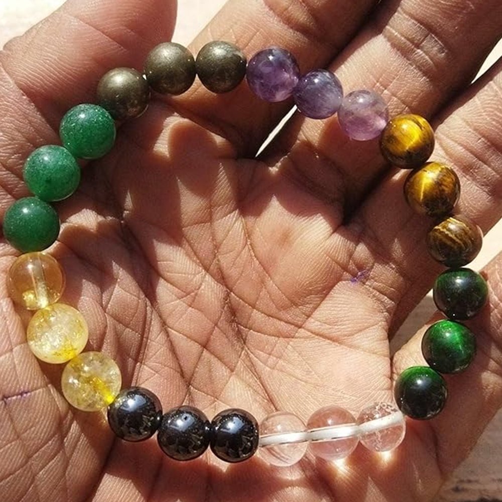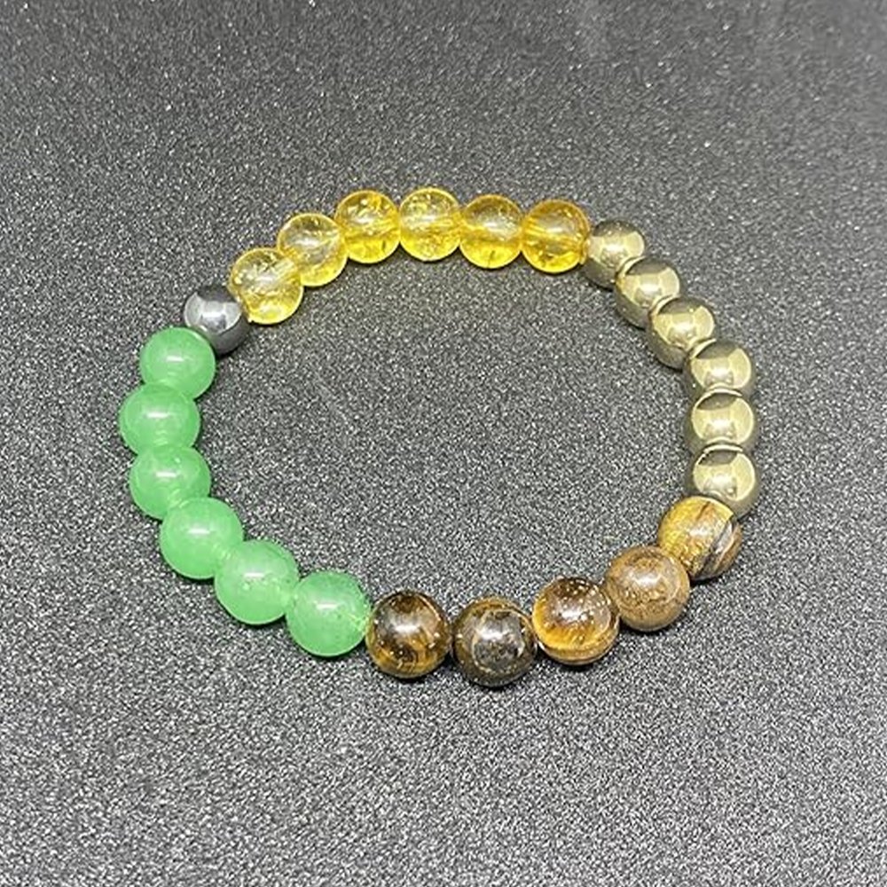 Attract wealth, success, and positive energy with this powerful Money Magnet Bracelet, handcrafted from 100% natural, certified healing gemstones. Designed for men, women, boys, and girls, this multi-color bracelet combines seven potent stones known for prosperity and abundance – Green Tiger Eye, Amethyst, Pyrite, Green Aventurine, Citrine, Hematite, and Clear Quartz.