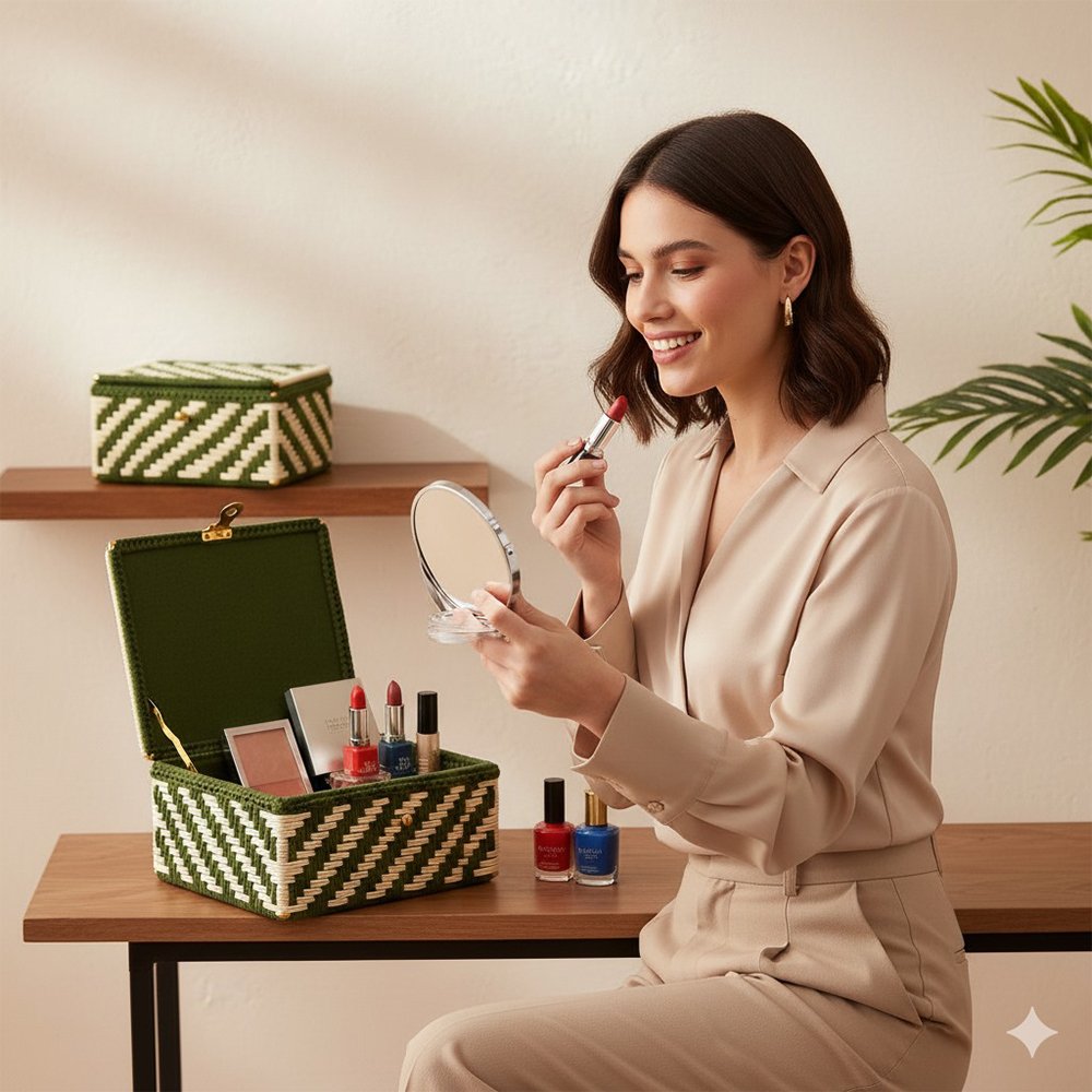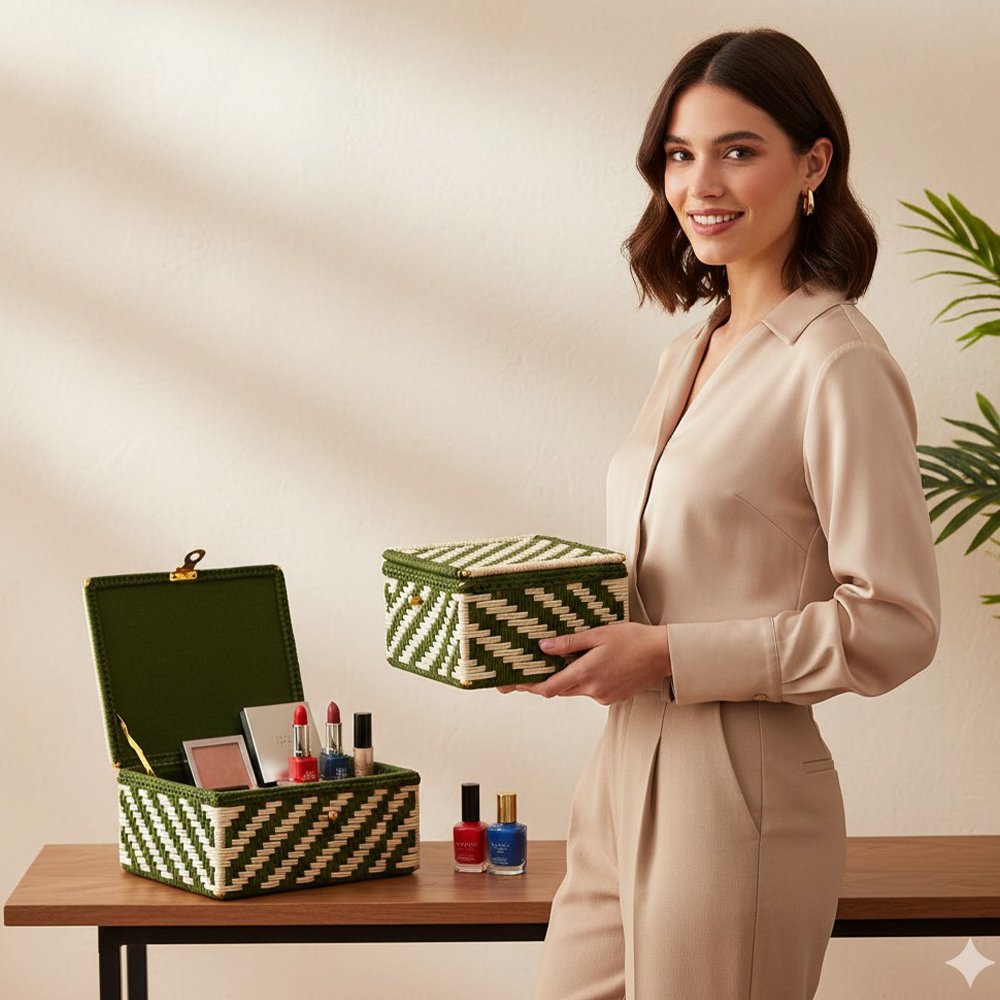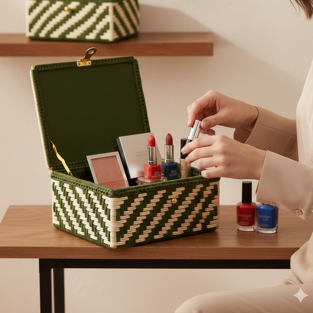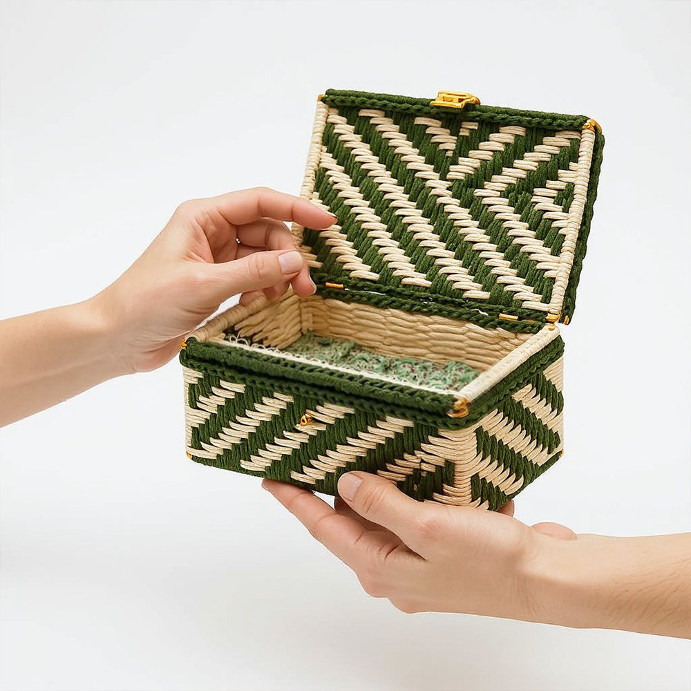 Organize with style using the Shahi Aura Handwoven Green & Natural Zigzag Basket Box. Expertly crafted by skilled artisans, this compact box combines rustic charm with modern design, featuring a striking chevron zigzag pattern in deep green and natural straw tones. Made from sustainably sourced natural fibers, it is lightweight yet sturdy, with elegant gold-tone corner accents adding a subtle touch of refinement. The secure hinged lid and clasp keep your belongings dust-free, while the soft lined interior protects delicate items. Perfect for storing jewelry, keepsakes, accessories, or desk essentials, its versatile design complements any decor, making it an ideal gift or travel-friendly organizer. Easy to maintain, simply wipe with a soft, dry cloth to preserve its handcrafted beauty.